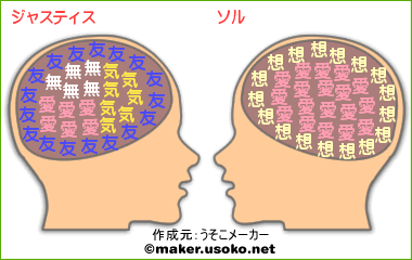 「気」っていうのが何を指しているのか判らないんですが、「無」が入っているジャスティスに比べると、ソルの脳内が普通に惚けてますよね。 一方通行感がたまりません。 いや、ジャスティスにも「愛」はあるんですけど、何よりその周りの「友」がね。