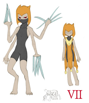 もったいないから、色だけ決めた。 これ以上は塗りません。 名前表記を見ると判りますが、本名じゃないです。 本人が覚えている・恐らく自分を指して使われていた文字列が「Vii」です。 正しくは「7」。 でもそれが「7」という意味だとヴィーは判っていない。 なので、ジャスティスを怒らせると、たまに「7号」と呼ばれます。 そう呼ばれるのが嫌なので、そう呼んで怒るぐらいにジャスティスを怒らせたら、素直に謝ります。 そして頭のは頭巾ということになった。